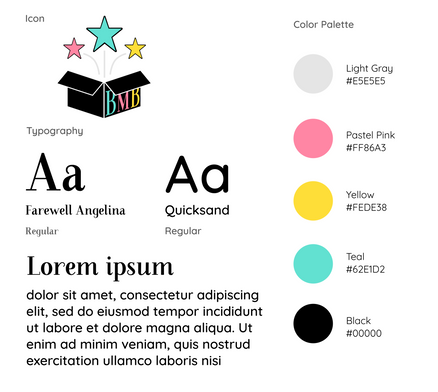 Our magazine moodboard reflected our changed theme of fun and empowerment with just a tiny bit of secrecy. Our style guide incorporated three main colors of pink, yellow, and teal. Black and light gray were used for text and decorative accents. Fonts were whimsical and playful. We believed that bright colors and rounded fonts would make the Black Magic Box more approachable to everyone. Stars were also added for aesthetic.